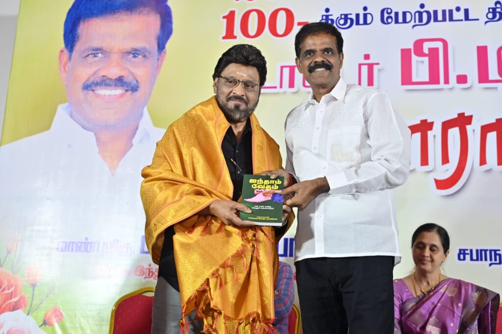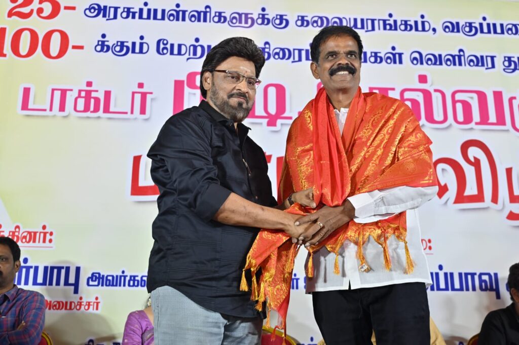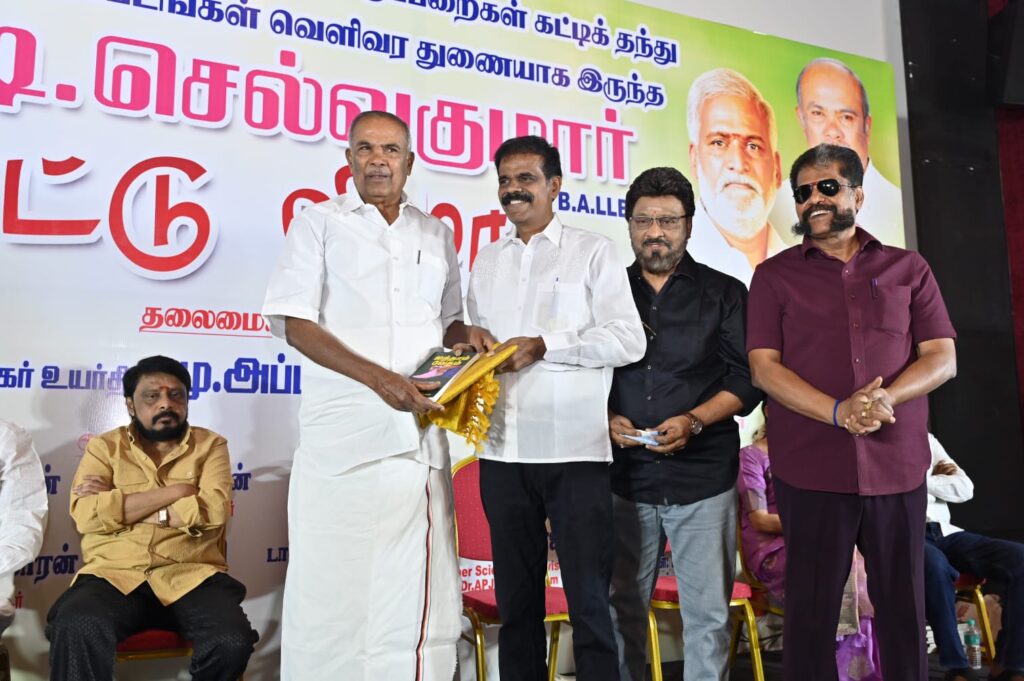 இயக்குநர் பி டி செல்வகுமாரை ”30 வருசத்துக்கு மேலா தெரியும். பத்திரிகையாளர், திரைப்பட தயாரிப்பாளர், இயக்குநர், நடிகர்னு பல அவதாரங்கள் எடுத்திருக்கார். நாட்டாமை படத்துல நடிச்சிருக்கார். அதனாலேயோ என்னவோ அவரே நாட்டாமையா மாறி பஞ்சாயத்து செய்து ரிலீஸ் பண்ண முடியாம பிரச்சனைகள்ல சிக்கியிருந்த ஏகப்பட்ட படங்களை ரிலீஸ் பண்ண உதவி பண்ணிருக்காரு. அவரோட கலப்பை மக்கள் இயக்கத்தோட பணிகள் பத்தி எனக்கு தெரியும். அவரு சினிமாவுல தளபதி விஜய்கூட இருந்தாரு. அரசியல்ல தளபதி ஸ்டாலின் அவர்களோட இருக்காரு. சினிமாவுல, சமூக சேவைகள்ல சாதிச்சது மாதிரி அரசியல்லயும் அவர் பெரியளவுல சாதிக்கணும்னு வாழ்த்தறேன்” என்றார்.