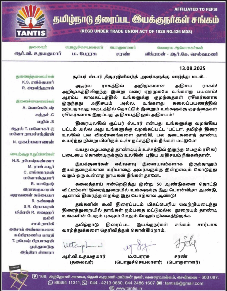 தங்களின் கூலி திரைப்படம் மிகப்பெரிய வெற்றியடைந்து திரைத்துறையில் தாங்கள் ஐம்பதை மட்டுமல்ல நூறையும் தாண்டி உங்களின் பேரும் புகழும் மேலும் மேலும் நிலைத்திருக்க எங்களது தமிழ்நாடு திரைப்பட இயக்குநர்கள் சங்கம் சார்பாக வாழ்த்துக்களை தெரிவித்துக் கொள்கிறோம்.