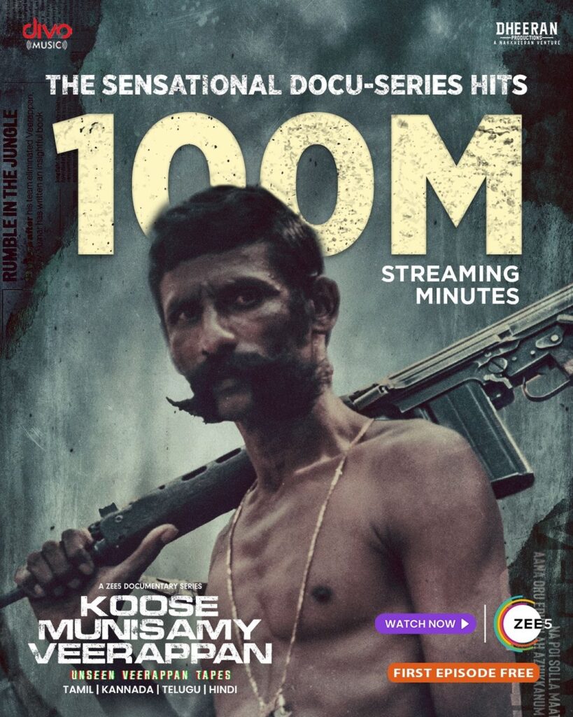 இந்தியாவின் முன்னணி ஸ்ட் ரீமிங் தளமாக ரசிகர்களால் கொண்டாடப்படும் Zee5 தளத்தில் சமீபத்தில் வெளியான ‘கூச முனிசாமி வீரப்பன்’ டாக்குமெண்ட்ரி சீரிஸ் 100 மில்லியன் பார்வை நிமிடங்களைக் கடந்து, சாதனை படைத்துள்ளது.