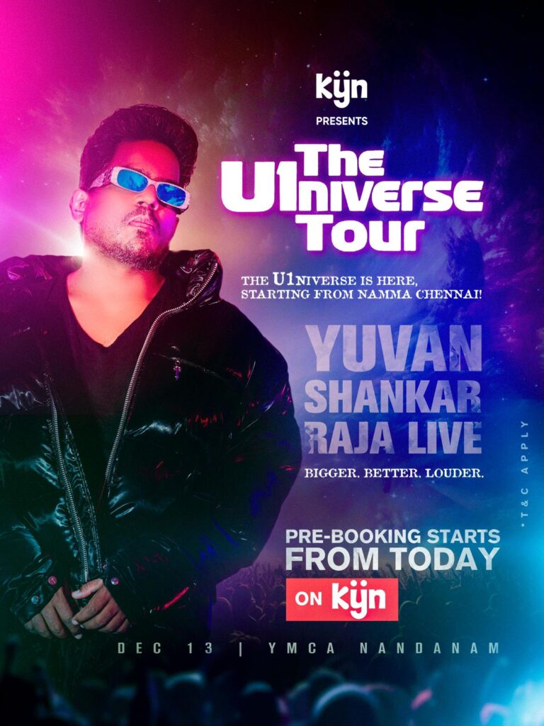 KYN வழங்கும் இசையமைப்பாளர் யுவன் சங்கர் ராஜாவின் ‘The U1niverse Tour’ இசை நிகழ்ச்சி டிசம்பர் 13 முதல் தொடங்க இருக்கிறது. முதலாவதாக, சென்னை YMCA மைதானத்தில் தொடங்க இருக்கிறது. டிக்கெட் பதிவு செய்யும் முதல் ஆயிரம் பேருக்கு யுவனின் கையொப்பமிட்ட டி-ஷர்ட் இலவசமாக வழங்கப்படும். இதுமட்டுமல்லாது, 10 அதிர்ஷ்டசாலி ரசிகர்களுக்கு யுவனுடன் புகைப்படம் எடுக்கும் வாய்ப்பும் கிடைக்கும்.