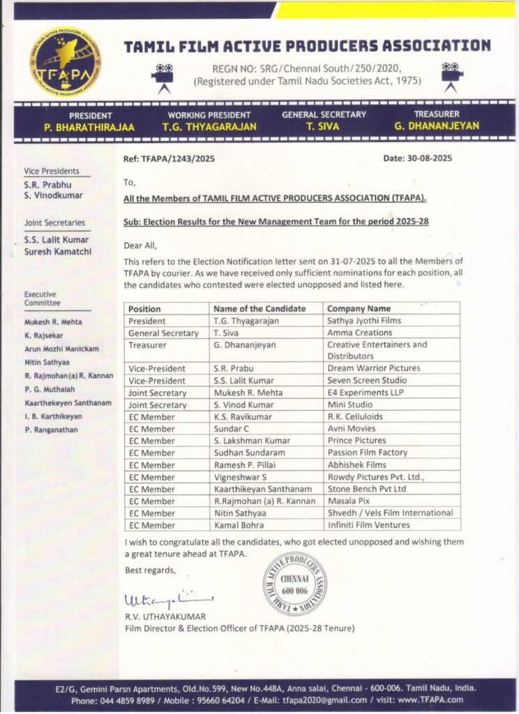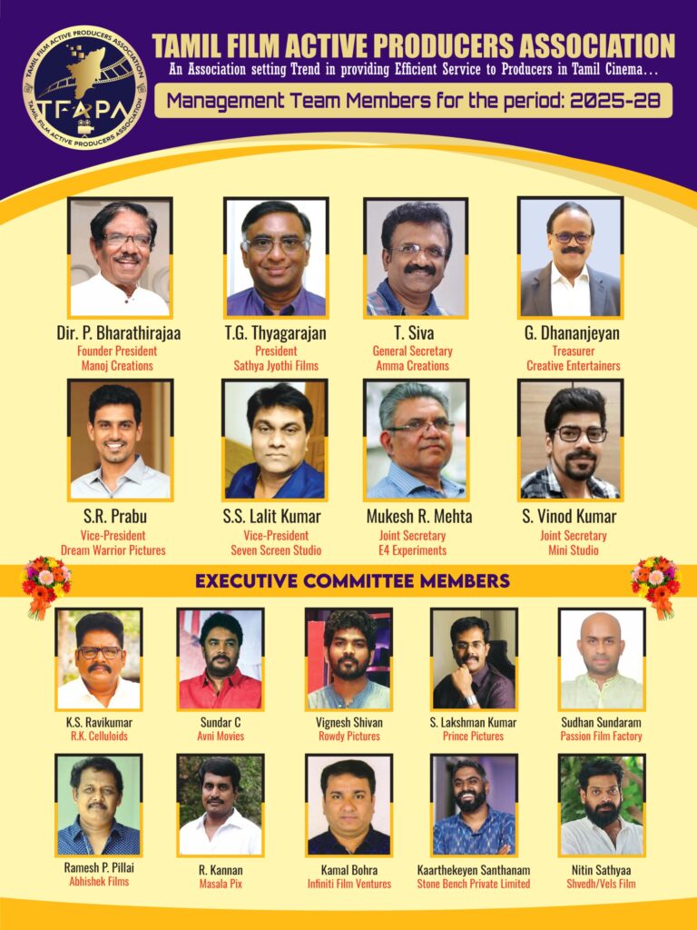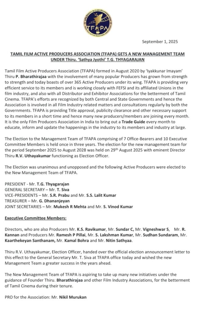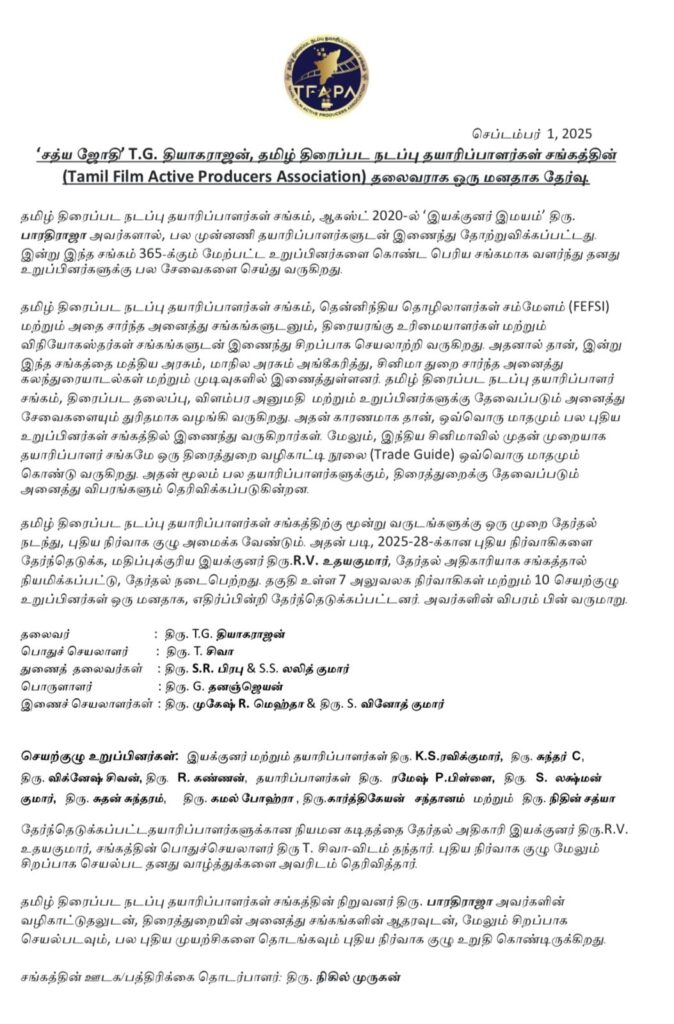 ‘சத்ய ஜோதி’ T.G. தியாகராஜன், தமிழ் திரைப்பட நடப்பு தயாரிப்பாளர்கள் சங்கத்தின் (Tamil Film Active Producers Association) தலைவராக ஒரு மனதாக தேர்வு.
