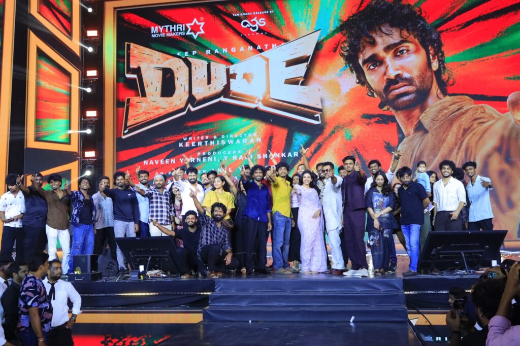 மைத்ரி மூவி மேக்கர்ஸ் தயாரிப்பில் கீர்த்தீஸ்வரன் இயக்கத்தில் நடிகர்கள் பிரதீப் ரங்கநாதன், மமிதா பைஜூ நடிப்பில் உருவாகியுள்ள படம் ‘டியூட்’. தீபாவளி பண்டிகையை முன்னிட்டு வரும் அக்டோபர் 17ஆம் தேதி வெளியாக இருக்கும் இந்தப் படத்தின் இசை வெளியீட்டு விழா பிரம்மாண்டமான சென்னையில் இன்று நடைபெற்றது.