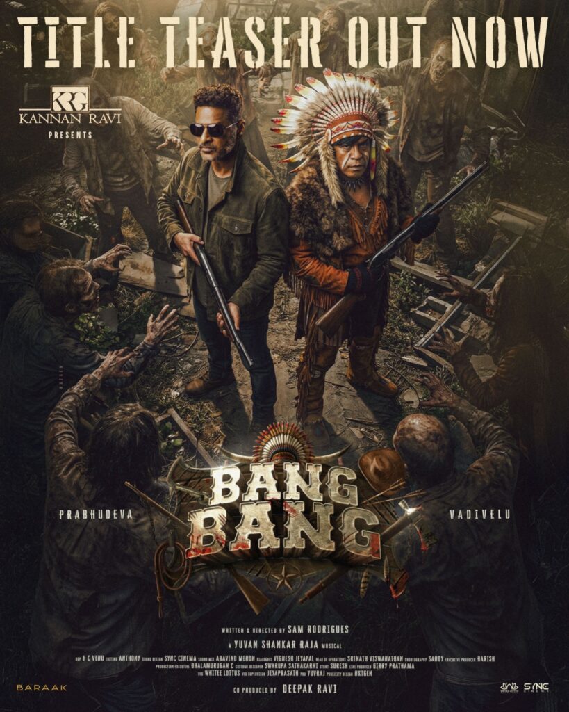 KRG கண்ணன் ரவியின் பிரமாண்ட தயாரிப்பில், தீபக் ரவி இணைத் தயாரிப்பில், தமிழ் திரையுலகின் மறக்க முடியாத கூட்டணியான நடனப்புயல் பிரபுதேவா, வைகைப்புயல் வடிவேலு மற்றும் இசையமைப்பாளர் யுவன் சங்கர் ராஜா மூவரும் 25 ஆண்டுகள் கழித்து மீண்டும் இணையும் “பேங் பேங்” படத்தின் டைட்டில் டீஸர் தற்போது அதிகாரப்பூர்வமாக வெளியிடப்பட்டுள்ளது. அந்த டீஸரில் ஜாம்பியாக மாறி ஓடுகிறார்கள். பிரபு தேவாவும், வடிவேலுவும் துப்பாக்கியுடன் கெத்தாக வருகிறார்கள். வடிவேலு ஜாம்பி என்று கூறுகிறார். பிரபு வேலு, வடி தேவா என்று பெயரோடு டீஸரை பார்க்கும் போது படத்தை பார்க்கும் ஆவலை தூண்டுகிறது.