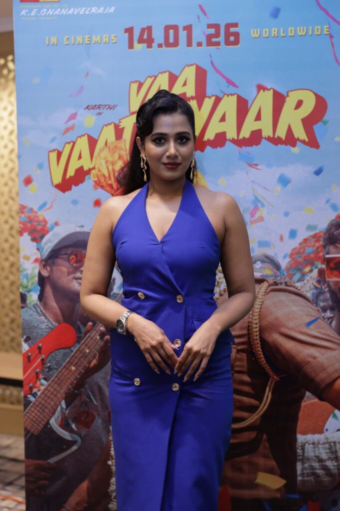 ஒரு பேட்டியில் நலன் சார் ஒரே விஷயத்தை “இது ஒரு பெஸ்டிவல் படம். பல குடும்பங்கள் ஒன்றாகச் சேர்ந்து வந்து பார்க்கிற படம்”என்று சொன்னார். இப்போது அது அப்படியே நடந்துள்ளது. குடும்பமா, நண்பர்களோடு, எல்லாரும் சேர்ந்து படம் பார்க்கிற மாதிரி இந்த படம் மாறியிருக்கிறது. அதுக்கு நான் ரொம்ப ரொம்ப சந்தோஷப்படுறேன். இந்த படம் தாமதமானது பற்றி நிறைய பேர் என்கிட்ட கேட்டார்கள். அந்த நேரத்தில் எனக்கும் கொஞ்சம் வருத்தமா தான் இருந்தது. ஆனால் நான் ஒன்று நம்புகிறேன் – நல்ல விஷயம் நடக்கவேண்டுமானால், அதுக்கு ஒரு சரியான நேரம் இருக்கும். கடவுள் நம்மளை காத்திருக்க வைக்குறார்னா,அதுக்குப் பின்னால் ஒரு பெரிய திட்டம் இருக்கும்னு நம்புறேன். அதனால இப்போ எல்லாம் சரியா நடந்ததுக்கு நான் ரொம்ப மகிழ்ச்சியா இருக்கிறேன். இந்தப்படத்தில் என்னைச் சேர்த்ததுக்காக நலன் சார், மற்றும் ஞானவேல் சார் இருவருக்கும் என் மனமார்ந்த நன்றி. நலன் சார் இந்த படத்திற்காக எவ்வளவு கடினமா உழைத்திருக்கார்னு நான் நேரில பார்த்திருக்கேன். அவர் வெற்றியைப் பார்க்க ஆவலாக இருக்கிறேன். கார்த்தி சாரின் தீவிர ரசிகை நான், ஆனால் அவரை நேரில சந்திச்ச பிறகு, நான் இன்னும் பெரிய ரசிகையா மாறிவிட்டேன். ‘வா வாத்தியார்’ கதாபாத்திரம் – பெரியதாக இருந்தாலும், அதை அவரைவிட சிறப்பாக யாராலும் செய்ய முடியாது. கார்த்தி மனதளவில் மிகச்சிறந்த மனிதர். அது அவரது கதாப்பாத்திரங்களிலும் பிரதிபலிக்கிறது, வா வாத்தியார் ஒரு நல்ல மனசு கொண்ட கேரக்டர் அது அவருக்குள்ள இயல்பாகவே இருக்கிறது. நான் அவரிடமிருந்து நிறைய கற்றுக்கொண்டேன். சந்தோஷ் நாராயணன் இசை படத்திற்கு மிகப்பெரிய பலமாக அமைந்துள்ளது. இப்படத்தில் உழைத்த அத்தனை கலைஞர்களுக்கும் நன்றி. அனைவருக்கும் நன்றி