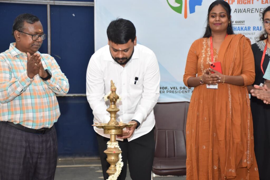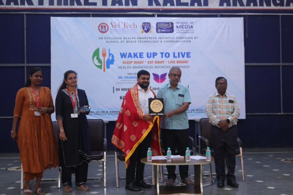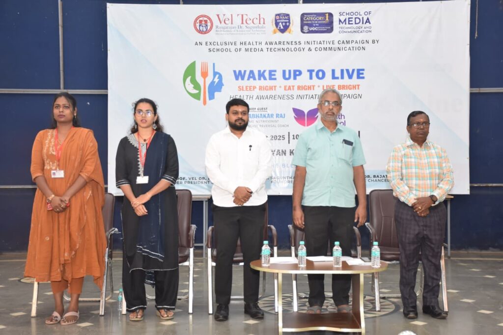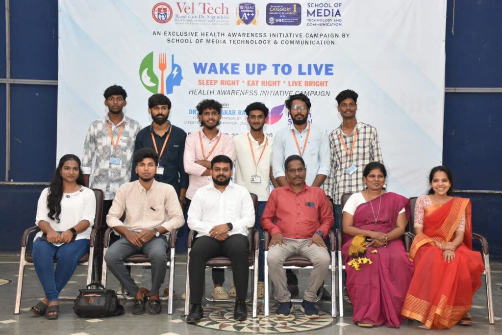வேல் டெக் ரங்கராஜன் டாக்டர் சகுந்தலா ஆராய்ச்சி மற்றும் வளர்ச்சி நிறுவனம், ஆவடி, சென்னை வளாகத்தில், ஊடகம் மற்றும் காட்சித் தொடர்பியல் புலம் சார்பில் “வேக் அப் டு லைவ் – சரியாக தூங்கு, சரியாக சாப்பிடு, பிரகாசமாக வாழ்” என்ற தலைப்பில் பொது உறவு நிகழ்ச்சி 05.11.2025 அன்று நடைபெற்றது.